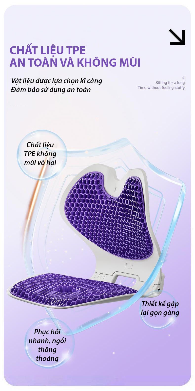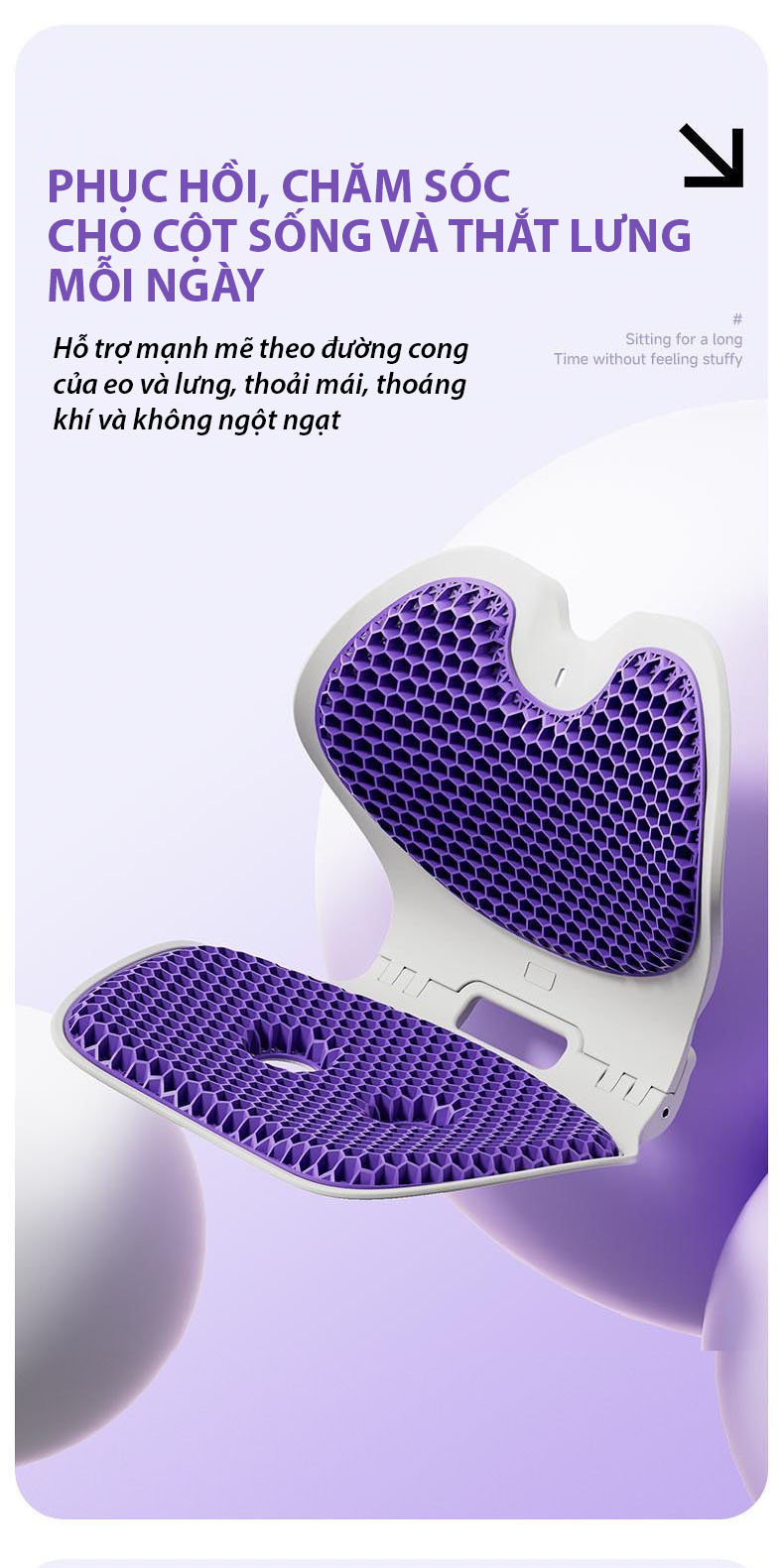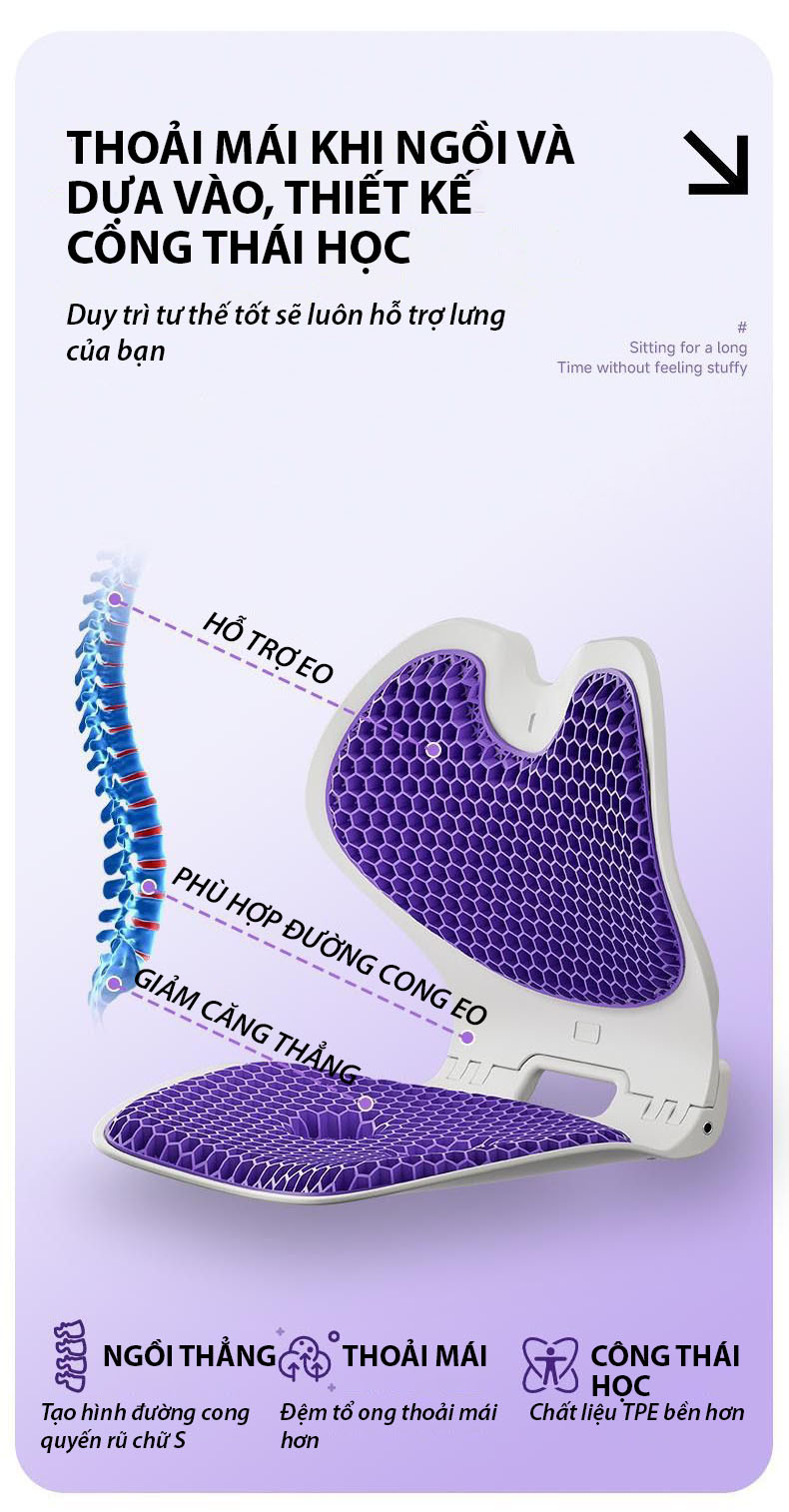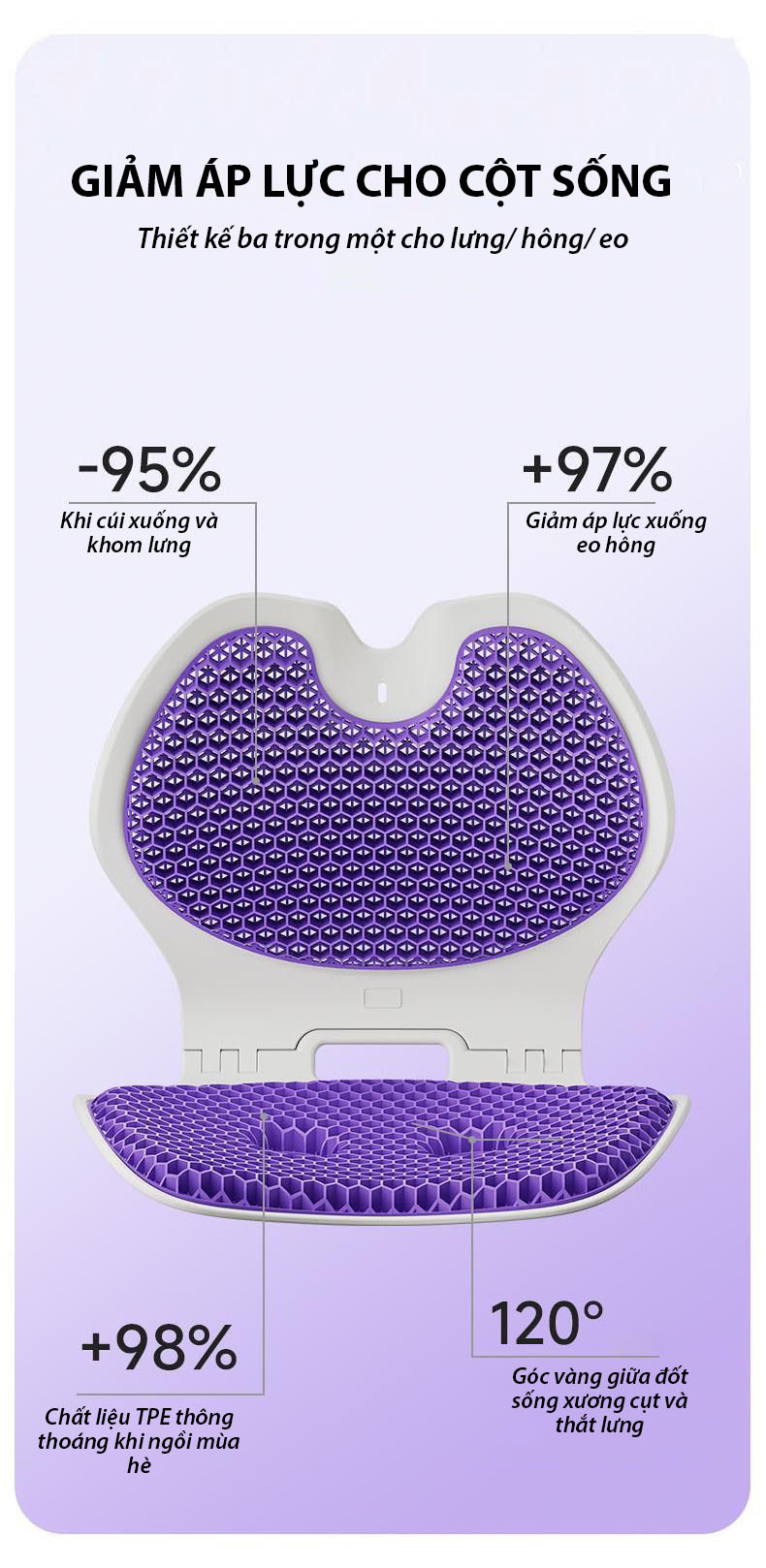 Đệm silicon tổ ong mật độ cao êm ái, thoáng khí, chống xẹp lún, phân tán áp lực đều, bảo vệ xương cụt và cột sống.