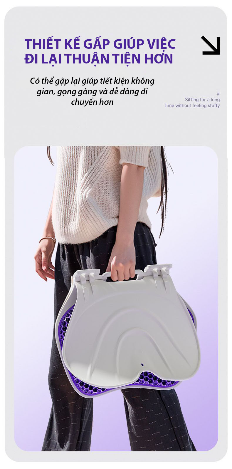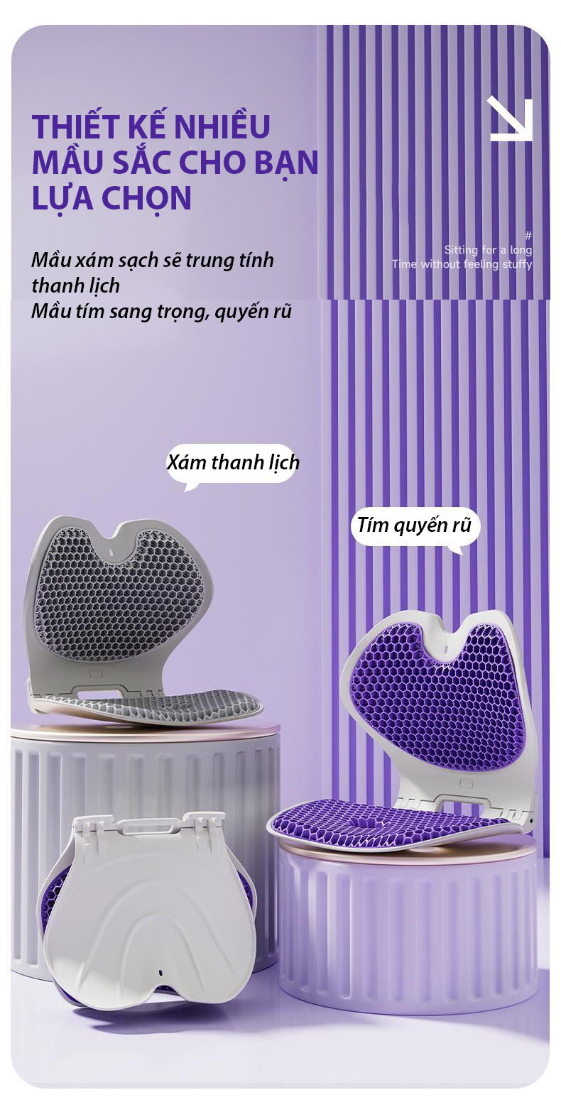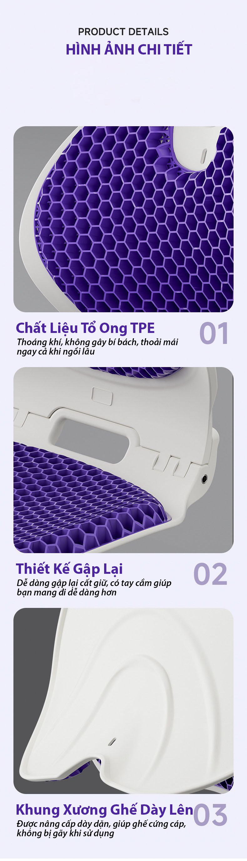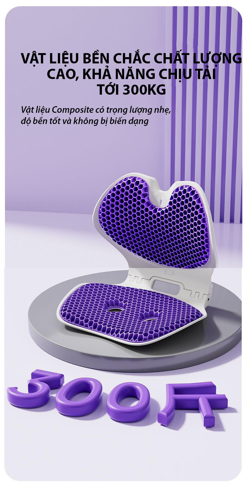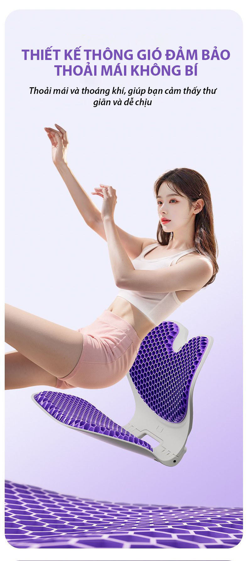 Đệm silicon tổ ong mật độ cao êm ái, thoáng khí, chống xẹp lún, phân tán áp lực đều, bảo vệ xương cụt và cột sống.
