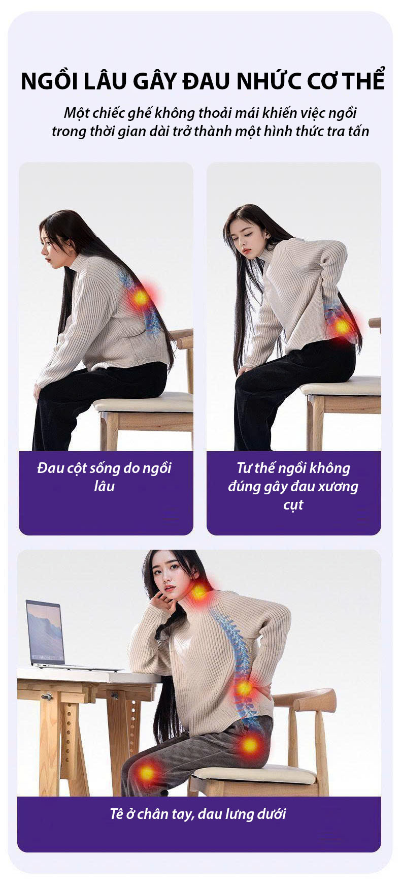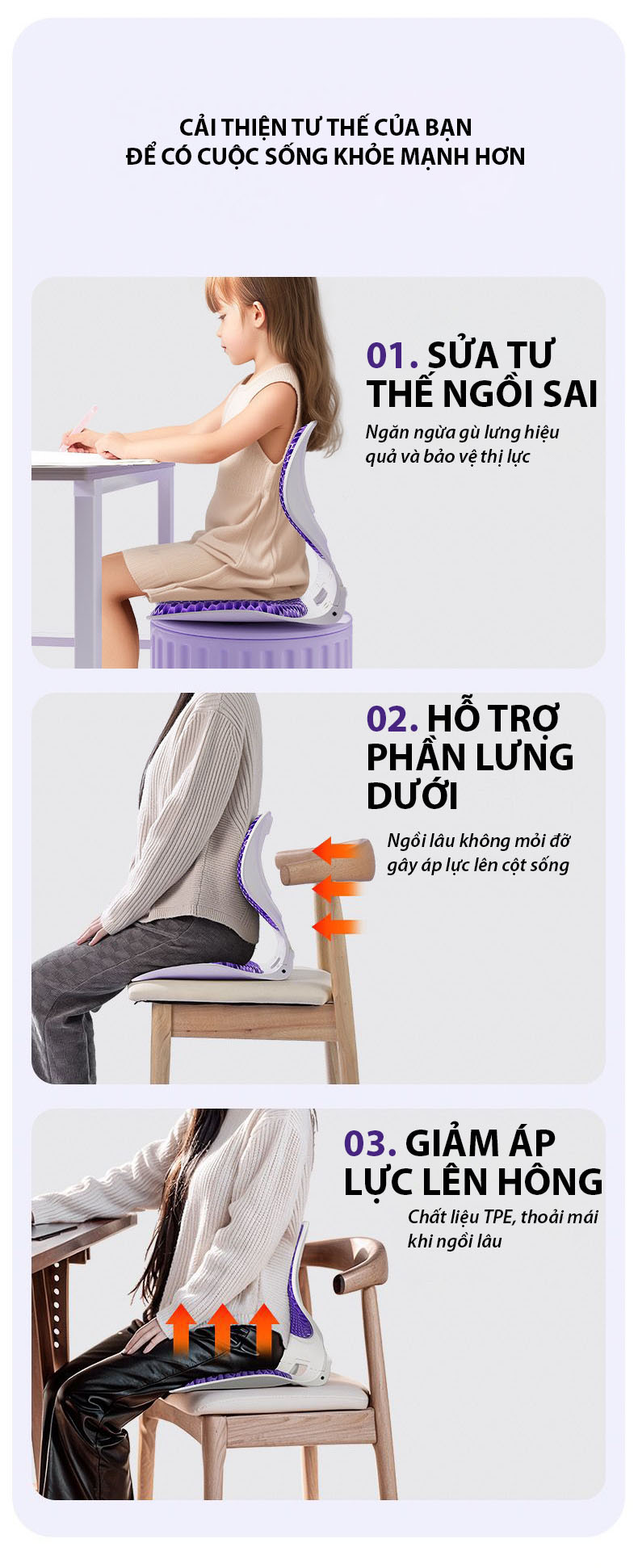Cải thiện sức khỏe cột sống toàn diện: Giảm đau mỏi lưng, chống gù, hỗ trợ điều chỉnh tư thế ngồi khoa học, phòng ngừa các bệnh lý về xương khớp.
